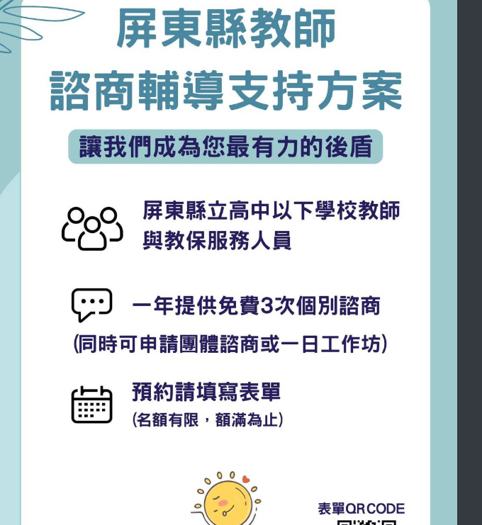 轉知屏東縣政府委請屏東大學辦理115年「屏東縣教師諮商輔導支持中心」案Post author:人事主任Post published:2026-04-26Post category:人事室 / 最新消息 / 置頂 / 選擇分類 / 重要公告屏東縣政府函-2下載附件1下載迎曦心理諮商所諮商資訊下載 Post Views: 14相關內容114年全國韻律體操錦標賽競賽規程及報名連結2025-02-08公告113學年度國際交流活動「國際使者」錄取名單2024-09-20114學年四年級百工使者徵選開始報名2026-02-10